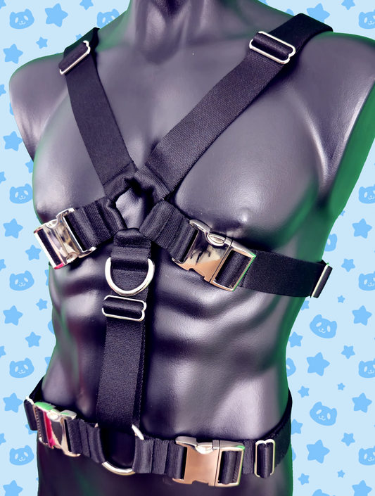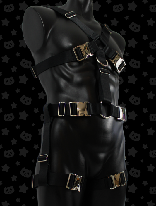 Chest Harness + Leg Straps - Black with Silver Metal Hardware