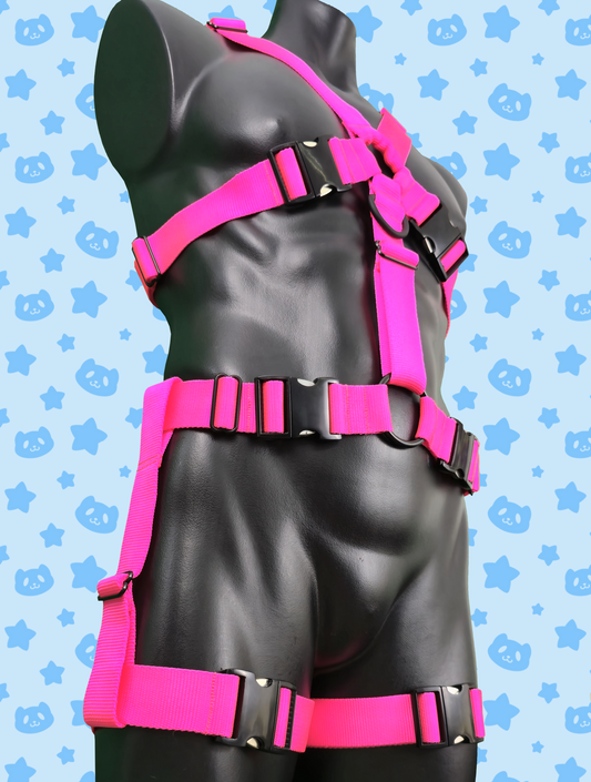 Chest Harness + Leg Straps - Neon Pink (UV Reactive) with Black Metal Hardware