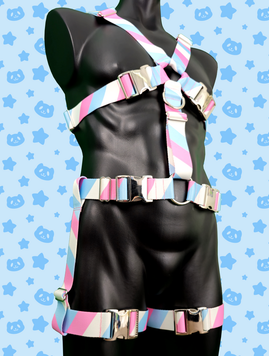 Chest Harness + Leg Straps - Trans Pride with Silver Metal Hardware