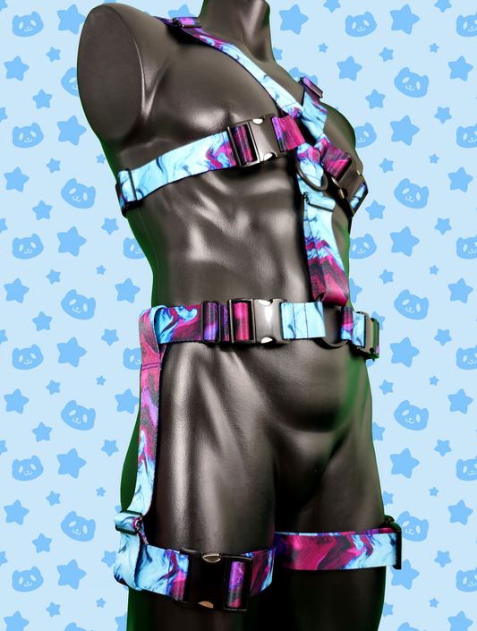 Chest Harness + Leg Straps - Whispy Purple + Blue with Black Metal Hardware