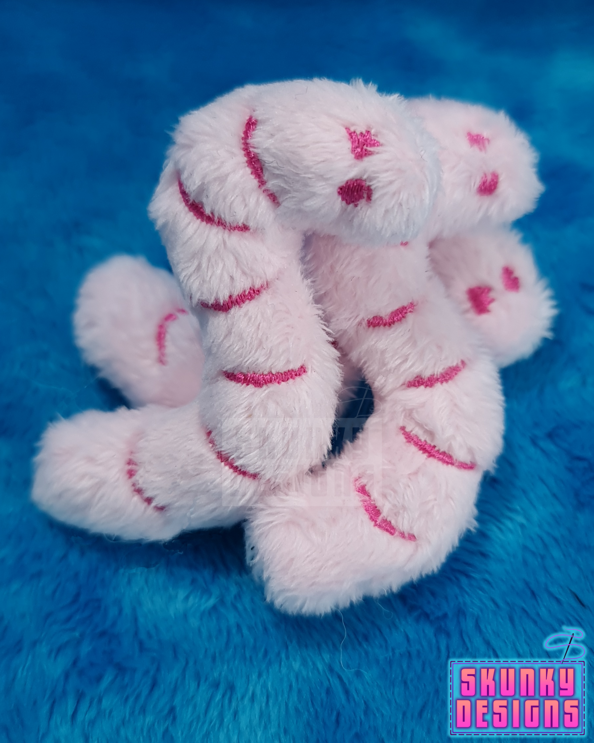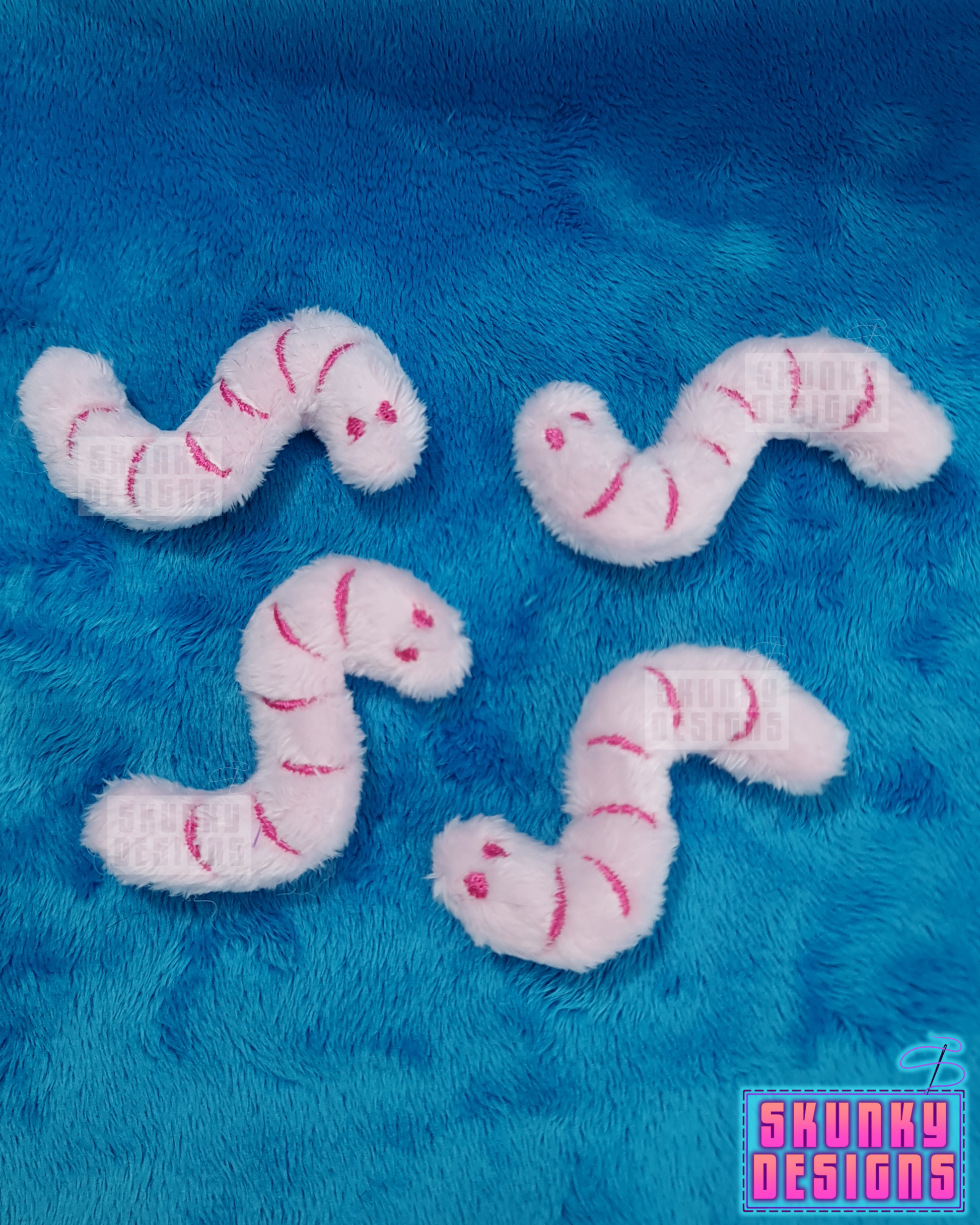 Lovingly hand made from soft minky fabric, the plush worm is 6.5cm / 2.5" tall! Perfect for stuffing in your pockets for some sensory fun, or into a fursuit mouth!